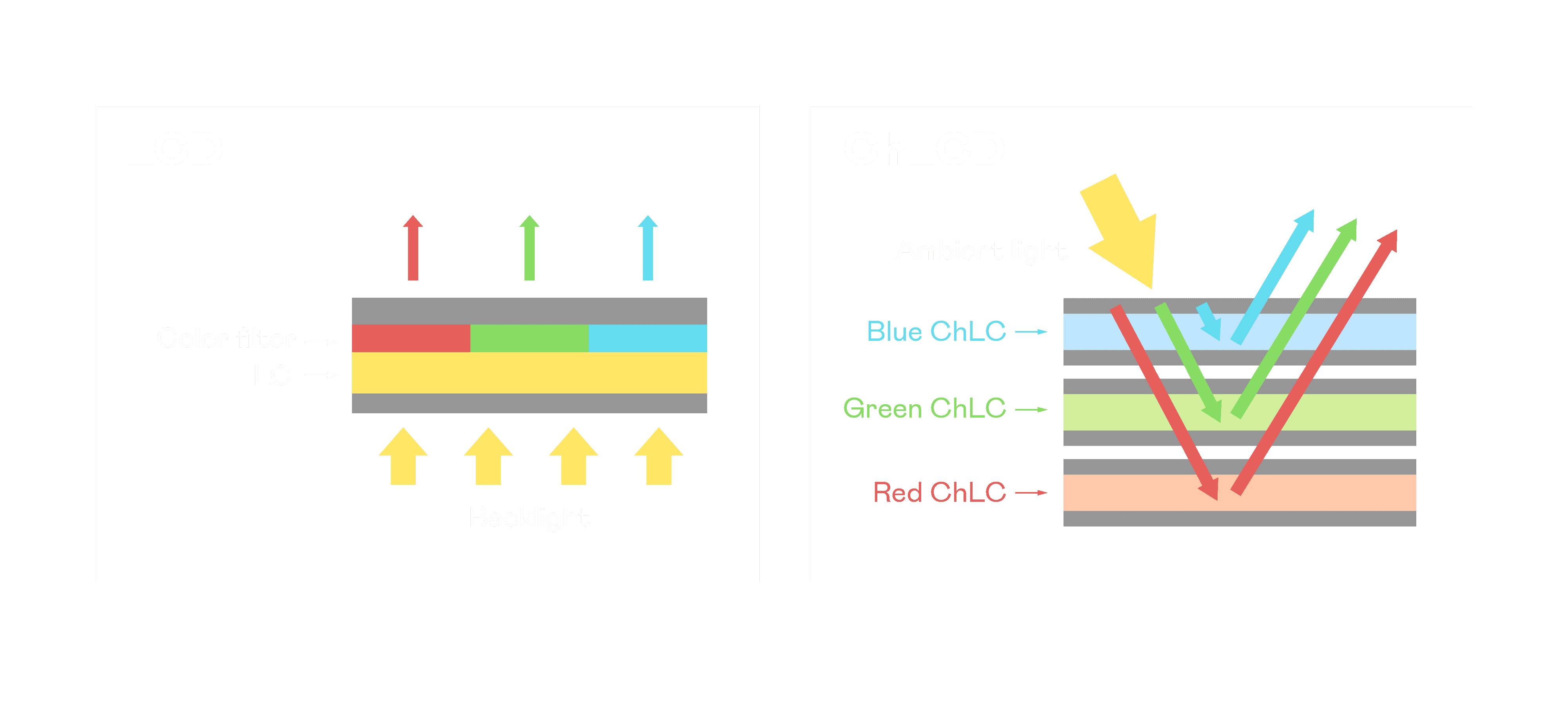 ChLCD 胆固醇液晶就如同纸张一样,,透过反射环境光来显示影像,,因此长时间观看不易造成人眼视觉疲劳,,,,可达到护眼效果。。。。当处于户外阳光下使用,,,,LCD 影像容易失真而不易观看,,但胆固醇液晶仍可维持较佳的影像品质。。
